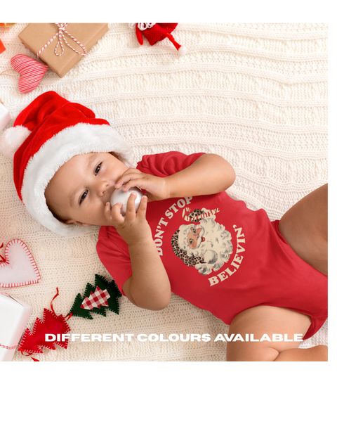 This cosy cotton-blend, fleece-lined sweatshirts, cotton short sleeve vest or long sleeve romper, both with poppers and envelope neck. Featuring our iconic Retro Santa with a leopard print hat and red zebra candy cane, finished with the bold Don’t Stop Believin’ slogan.